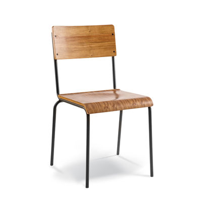 Industrial vintage look comprising moulded plywood seat and back on epoxy coated steel frame.