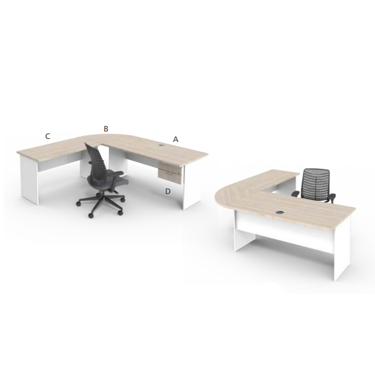 Corner links to extension desks and storage units increase workspace , suspended pedestals offer an inexpensive solution to storage.