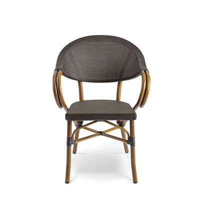 Fully outdoor comprising weather proof Textilene mesh seat and back.